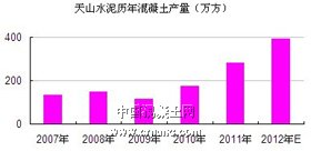 2012年上半年公司總營業(yè)收入為33.84億元,較2011年同期增長了0.69%。混凝土業(yè)務(wù)提升明顯,營業(yè)收入為3.9億,較2011年同期增長了28.23%,毛利率為15.65%,同時也占了總收入的11.52%。再從天山水泥歷年的混凝土產(chǎn)量來看,從2009年起,公司商品混凝土就進入了穩(wěn)步向上的趨勢,2011年更是突破了200萬方。砼網(wǎng)預(yù)計2012年的產(chǎn)量或?qū)⑦_到400萬方左右。