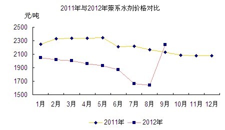 反觀萘系減水劑,世界任何一件產品都經歷著更新換代,減水劑也不例外。近兩年,萘系減水劑價格逐步下降,說明了萘系減水劑需求連年下降,正逐漸被聚羧酸減水劑替代。從下圖可以看到,從2011年后半年萘系減水劑價格便一路下滑,期間所謂的旺季都沒有帶動起萘系市場。2011年,萘系水劑全年平均價格為2214元/噸;而截至2012年10月,平均價格已經跌破2000大關,至1931元/噸。