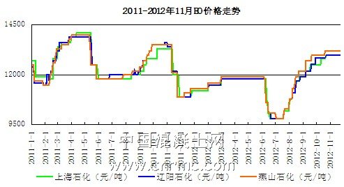 2012年末將至,環氧乙烷市場行情稍顯平淡。自今年暴漲暴跌一番之后,環氧乙烷市場似乎進入了平臺期。本月十八大的召開,對環氧乙烷市場產生較大影響,北方部分環氧乙烷工廠停工,商家也在此期間進行設備檢修,無力經營。從十月中下旬至今,成交清淡,價格盤穩運行。目前均價維持在13000元/噸附近。直至十八大閉幕,環氧乙烷價格也并未出現反彈。