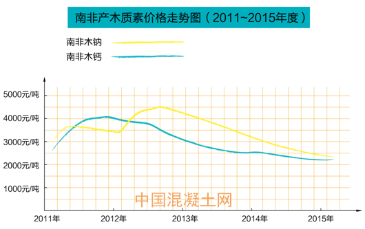 萘系減水劑另外一個主要原材料木質素磺酸鈉和木質素磺酸鈣也受到整個建材市場的波及,價格受到比價大的波動,由于市場需求量急劇減少,導致大量原料供過于求,國內外生產廠家主動下調價格來爭取更多市場。對比主要2個木質素出口大國俄羅斯和南非,俄羅斯的木質素磺酸鈉價格更是跌到谷底,這跟俄羅斯本國經濟低迷也有一定關系。近4年俄羅斯木質素價格如圖2: