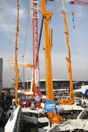 位于中聯(lián)重科混凝土機械公司展區(qū)中央的101米碳纖維臂架泵車無疑是寶馬展上的重磅明星,絢麗的外觀、入云的臂架,帶來無與倫比的視覺震撼。