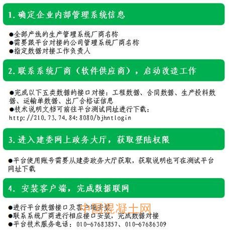 (一)各預拌混凝土生產企業應按照平臺發布的“預拌混凝土生產運輸信息采集接口”數據標準,于2016年3月31日前,完成企業生產、管理系統與平臺的對接工作(具體流程見附件)。