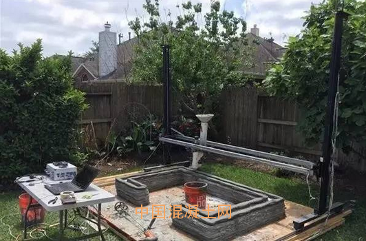 Alex使用的混凝土3D打印機是他仿照之前另一位美國學生自行研制的同類型設備制造的,是一臺典型的RepRap 3D打印機,打印尺寸有10英尺 x 10英尺 x 10英尺(約3米 x 3米 x 3米),打印速度約為9厘米(水平)/秒,流量約為4升/秒。對于一臺自制的建筑3D打印機,這已經足夠好了。不過更重要的是,它的結構十分簡單,只需30分鐘即可準備完畢,所以使用起來非常方便。