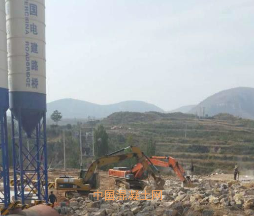 接報后,記者迅速趕往現場調查。在邢臺縣太子井鄉峰門村村西一公里附近,發現了該攪拌站。現場已用鐵架子架起了兩個個高高的圓形槽罐,槽罐罐體上醒目標有“中國電建路橋”幾個大字。一些工人正在一旁施工,兩臺鉤機輛和塔吊也正熱火朝天地作業,工地一角建設的住房也已經蓋有一米來高。大量石子凌亂地散布在施工現場。根據目測估計,這家攪拌站至少占地20余畝。