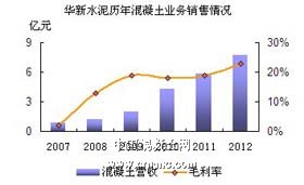 2012年全國水泥行業利潤總額較2011年下降了32.81%,但是中國建材營業收入仍然達到了872億元,較2011年增長了8.9%,這很大程度上需得益于其混凝土業務。
