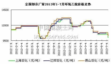 事后,環氧乙烷市場受到小幅度的影響,6月27日華東環氧乙烷市場價格上漲300元/噸,其他地區價格漲幅在100元/噸左右,價格并無太大波動。另外,在該起事故發生的同時,上海石化14萬噸環氧乙烷也即將投產,在環氧乙烷產能激增的同時,下游市場卻需求低迷,乙二醇華東市場行情較為清淡,令本應該是旺季的二季度市場顯得十分蕭條。在上下游雙重利空因素夾擊下,二季度環氧乙烷市場也一路猛跌。華東市場在上漲300元后,價格開始回落,跌回10500元/噸。預計上海石化EO裝置投產以后,下游需求不佳,市場交投乏力,大量的產能釋放后,原本緊俏的環氧乙烷變得供大于求,環氧乙烷各廠家庫存緩慢上升,價格還會迎來一次探底。
