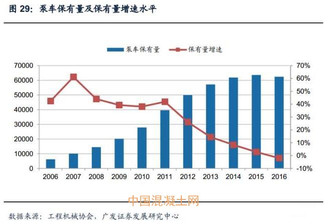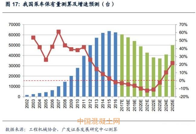 3)環保政策的強化。為貫徹《中華人民共和國大氣污染防治法》,嚴格控制機動車污染,全面實施《輕型汽車污染物排放限值及測量方法(中國五階段)》中規定的國五標準,自2017年7月起,不再生產和銷售非國五標準的重型柴油車。對工程機械領域的攪拌車、泵車和車載泵等都有積極的影響。目前存量的工程機械設備,包括混凝土機械設備,主要都是國二和國三標準的,排放污染較大。隨著環保法規執行越來越嚴格,未來具備較大的可替換空間。