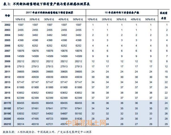 2016年是保有量供給拐點的轉折之年。通?;炷翙C械設備的保有年限為8年,但是由于過去較低的利用率,我們保守的按照10年折舊更新年限估算更新需求,采取“保有量=上一年保有量+新機銷售-更新需求”的計算過程來估算存量保有數據,新機銷售具有不確定性,我們中性的考慮2017-2021年的增速水平為30%(由于幾年新機銷售萎靡,基數較低,即便是以30%的復合增速增長,到2021年的絕對銷量僅為4284臺,不足高峰期的一半,與2008年的銷量水平相似)。根據模型結果,2015年保有量為6.4萬臺(落在協會估算的預測范圍內),2016年混凝土泵車保有量約為6.24萬臺,保有量數據從2002年第一次增速下滑。供給的持續收縮,新機銷售持續下滑和更新設備量出清,全社會有效產能供給開始收縮。