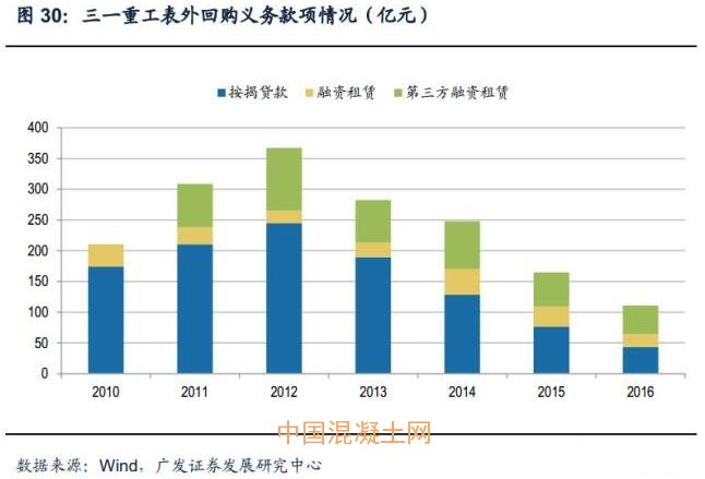 主機廠在資產負債表端也背負著較大的壓力,主要是長期信用擴張形成的應收賬款和表外或有負債。以行業兩家主要的工程機械企業為例,三一重工的表外或有負債水平從2012年以后持續下滑,中聯重科從2014年以后也逐步下滑,到2016年底,存量的或有擔?;刭徚x務款僅相當于高點時候的20-30%,風險敞口得以大幅度縮窄,逾期的應收賬款也清理得比較徹底。
