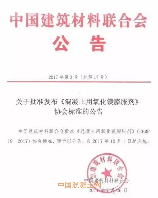 日前,中國建筑材料聯(lián)合會發(fā)布公告,批準發(fā)布《混凝土用氧化鎂膨脹劑》(CBMF19-2017)協(xié)會標準,該標準將自2017年10月1日起正式實施。