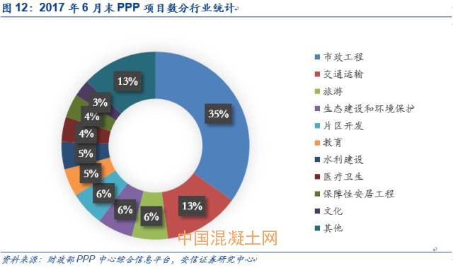 根據財政部發布的數據,截至6月末PPP項目數各行業分布情況如圖所示。其中,市政工程、交通運輸和生態建設和環境保護位列項目比例前三名,分別為4732、1756和826個,共占所有入庫項目的54%。