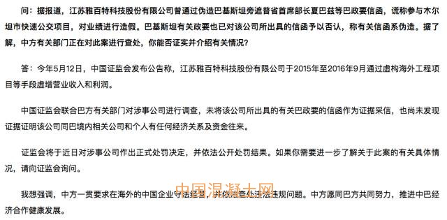 9月4日,外交部發言人耿爽在例行記者會上證實,A股上市公司雅百特(002323)曾通過虛構海外工程項目等手段,虛增營業收入和利潤,并涉嫌偽造巴基斯坦政要信函,證監會將于近日對涉案公司作出正式處罰決定。
