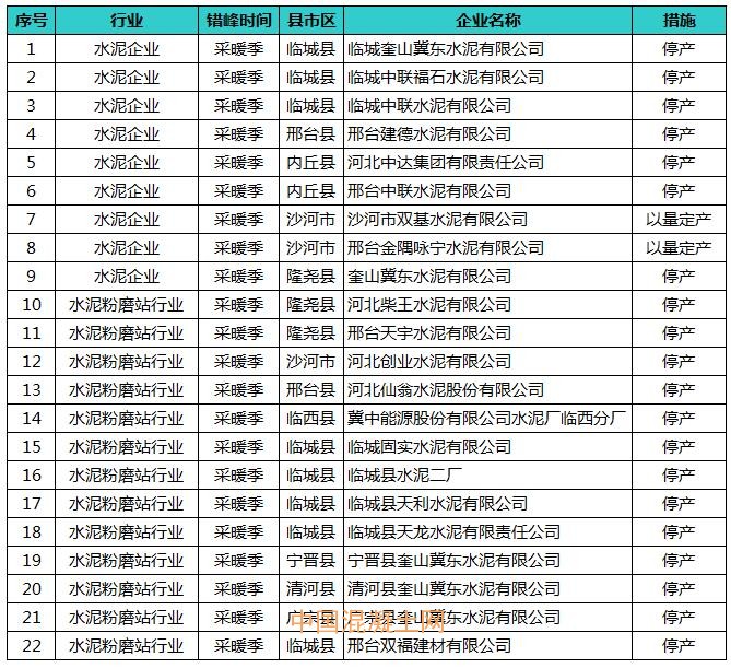 邢臺(tái)市2017—2018年秋冬季錯(cuò)峰生產(chǎn)水泥企業(yè)名單