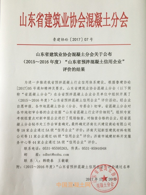 (2015~2016年度)“山東省預拌混凝土信用企業”評價通過名單