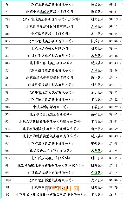 本季度得分最高的企業(yè)為北京市高強(qiáng)混凝土有限責(zé)任公司豐臺(tái)西道口分站98.21分,得分最低的企業(yè)為北京鑫旺華宇混凝土制品有限公司76.18分,全市混凝土企業(yè)得分排名詳見附件2。