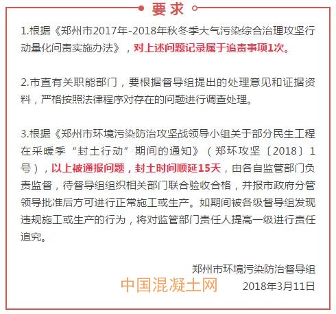 鄭州市環(huán)境污染防治督導(dǎo)組,3月11日對(duì)幾家違規(guī)“破土”施工的單位進(jìn)行通報(bào),并將嚴(yán)格按照法律程序?qū)Υ嬖诘膯?wèn)題進(jìn)行調(diào)查處理,被通報(bào)問(wèn)題的單位封土?xí)r間順延15天。