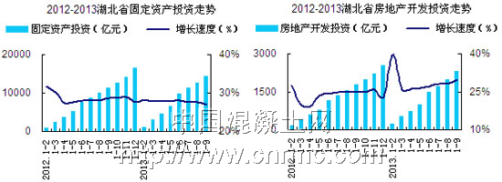 2013年1-9月,湖北省固定資產累計投資額14418.75億元,同比增長27%,增速較2012年同期的28.6%略有回落。前三季我國固定資產投資累計同比增速持續緩慢回落,國民經濟和投資已從高速增長轉入平穩增長。