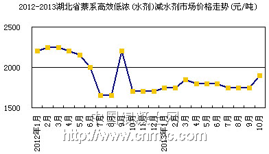 10月份,湖北地區萘系減水劑受到原料工業萘方面影響,減水劑略有小幅提價,截止10月底萘系高效低濃(水劑)減水劑市場價格多在1800-2000元/噸之間。