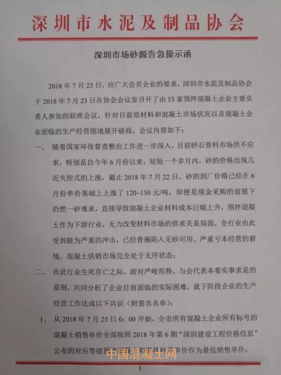 近日,深圳市水泥及制品協會發布《深圳市場砂源告急提示函》,該提示函稱:目前深圳地區,砂的價格出現失控式上漲,截止2018年7月22日,砂的到場價格已在6月基礎上上漲了120-150元/噸,即便砼企現金采購之下,依然一砂難求,“有市無價”,直接導致砼企材料成本巨額提升,普遍出現無砂可用的境地,嚴重虧本經營的處境,給當地的混凝土市場造成沖擊。
