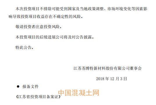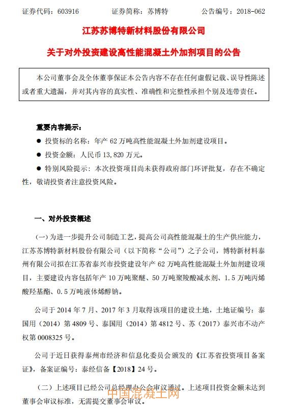 12月3日晚間,蘇博特(603916)發(fā)布公告稱,為進一步提升公司制造工藝,提高公司高性能混凝土的生產(chǎn)供應能力,公司子公司博特新材料泰州有限公司擬在江蘇省泰興市投資建設(shè)年產(chǎn)62萬噸高性能混凝土外加劑建設(shè)項目,投資金額為1.38億元。主要建設(shè)內(nèi)容包括年產(chǎn)10萬噸聚醚、50萬噸聚羧酸減水劑、1.5萬噸丙烯酸羥基酯、0.5萬噸液體烯醇鈉。