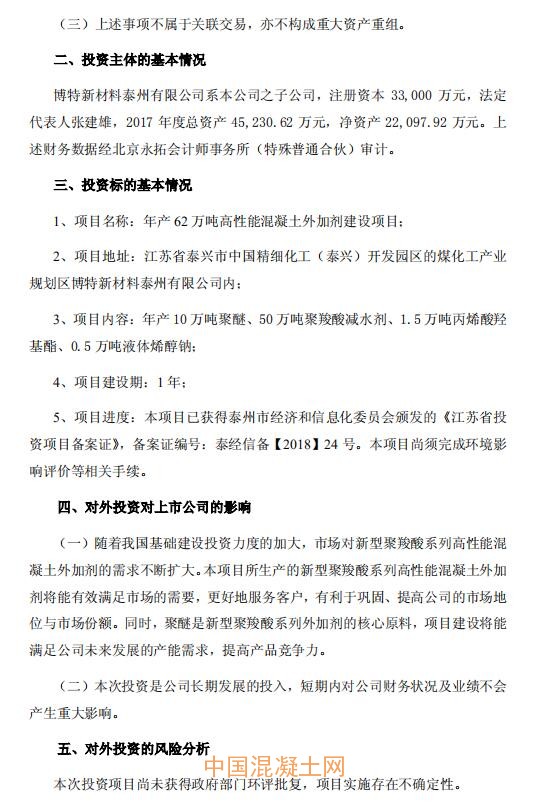 公司稱,隨著我國基礎(chǔ)建設(shè)投資力度的加大,市場對新型聚羧酸系列高性能混凝土外加劑的需求不斷擴大。本項目所生產(chǎn)的新型聚羧酸系列高性能混凝土外加劑將能有效滿足市場的需要,更好地服務客戶,有利于鞏固、提高公司的市場地位與市場份額。同時,聚醚是新型聚羧酸系列外加劑的核心原料,項目建設(shè)將能滿足公司未來發(fā)展的產(chǎn)能需求,提高產(chǎn)品競爭力。