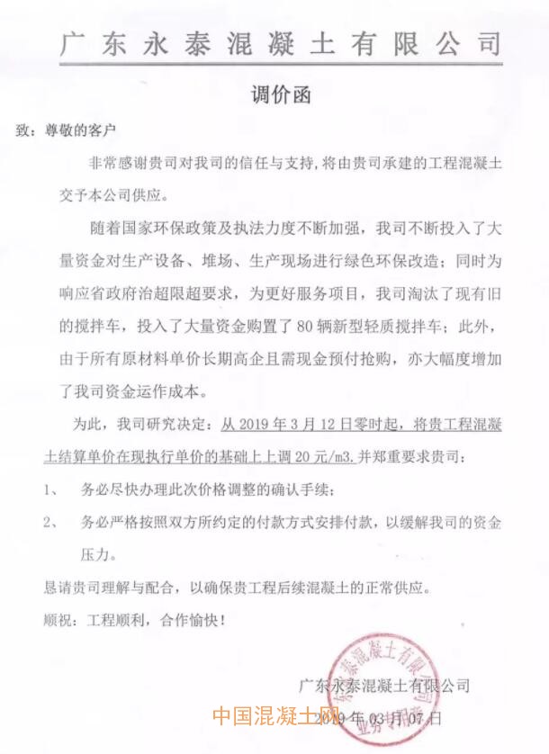 綜上原因,為確保能為客戶提供優(yōu)質(zhì)的混凝土,公司研究決定從3月10日零時(shí)起,各等級(jí)混凝土價(jià)格從原單價(jià)基礎(chǔ)上上調(diào)30元/立方米,并要求客戶按時(shí)支付貨款。今后公司將繼續(xù)根據(jù)原材料價(jià)格波動(dòng)情況,實(shí)時(shí)對(duì)產(chǎn)品結(jié)算價(jià)格進(jìn)行相應(yīng)的調(diào)整,并及時(shí)將市場(chǎng)情況告知客戶。調(diào)價(jià)函原文如下: