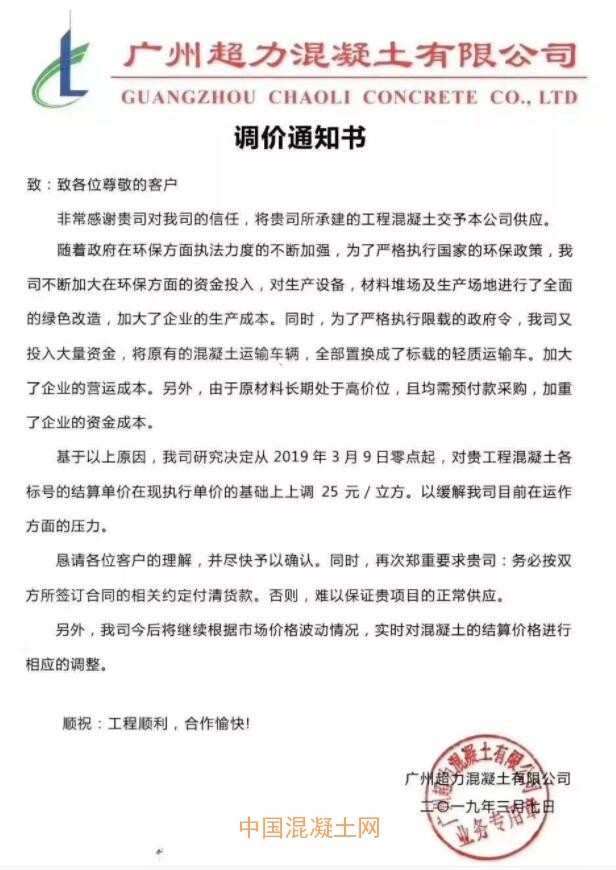廣州超力鐘村混凝土有限公司調(diào)價(jià)通知,從3月9日零點(diǎn)起,上調(diào)25元/立方米。