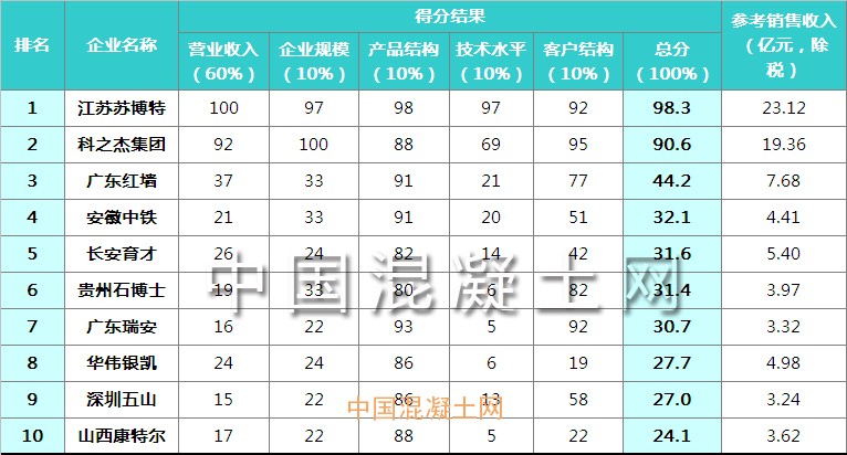 中國混凝土網此次評選出的外加劑企業綜合十強是經多方調查統計,搜集了國內大型重點外加劑企業的銷售收入、企業規模等數據,以2018年各企業實際銷售額為依據,經過對各項數據的權重比較得出最終排名。數據主要來自各外加劑企業上報、企業年報以及政府審計報告。