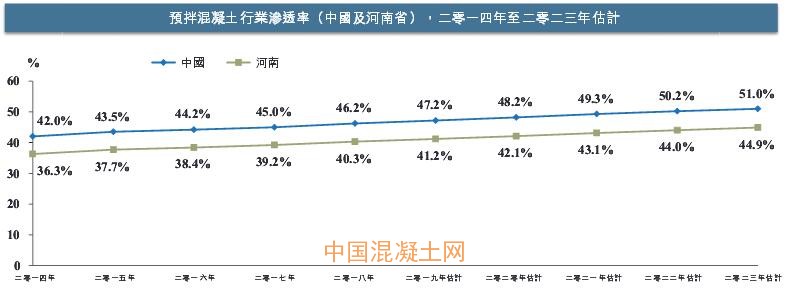 根據(jù)2017年出臺的《關于預拌混凝土行業(yè)淘汰落后與轉型升級指導意見》,現(xiàn)場混凝土生產等落后及不環(huán)保的生產方法在未來將逐步淘汰。而在2018年河南省內預拌混凝土滲透率僅為40.3%,不及全國平均值46.2%,更是遠低于華東發(fā)達省份的70%。據(jù)預計,河南預拌混凝土市場將持續(xù)整合并在2023年達到44.9%的滲透率。