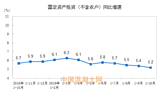 根據(jù)國家統(tǒng)計局數(shù)據(jù)顯示,2019年1-10月份,全國累計水泥產量19.1億噸,同比增長5.8%;全國固定資產投資(不含農戶)510880億元,同比增長5.2%,增速比1-9月份回落0.2個百分點;全國房地產開發(fā)投資109603億元,同比增長10.3%,增速比1-9月份回落0.2個百分點。