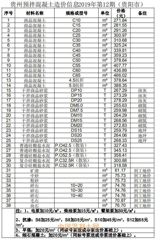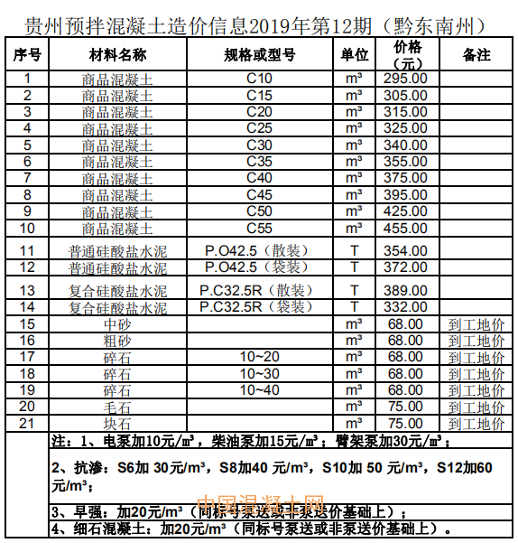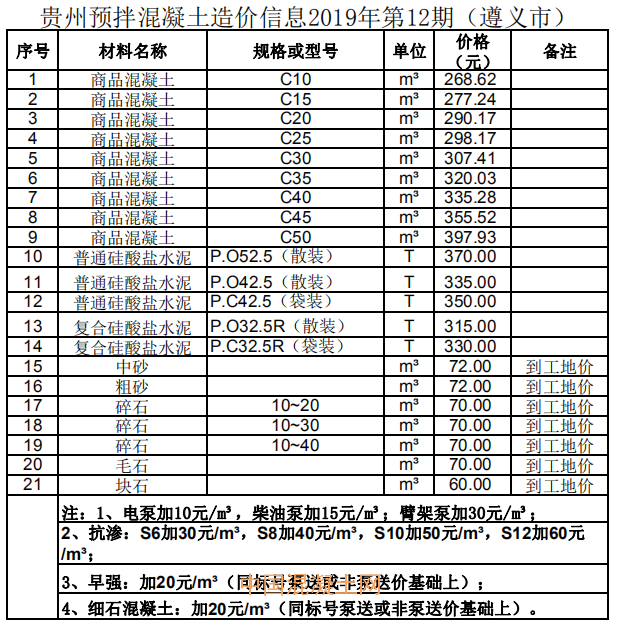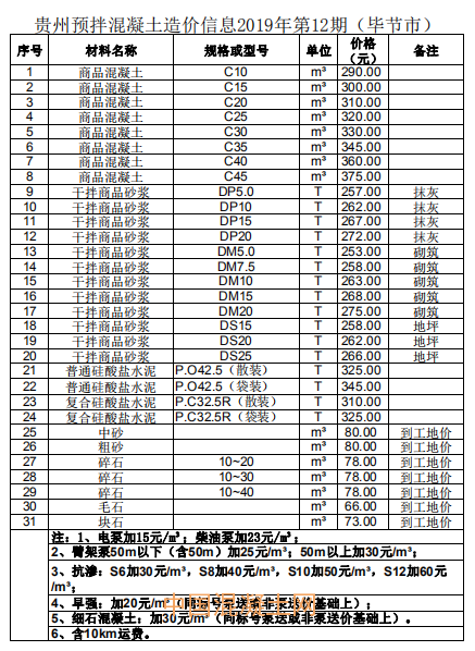 1月9日,貴州省預拌混凝土行業協會發布了貴州省預拌混凝土造價信息2019年第12期。造價信息顯示,商品混凝土平均價格高于干拌商品砂漿、硅酸鹽水泥等其他預拌混凝土。其中,銅仁市商品混凝土C60與六盤水市商品混凝土c60價格最高,為470元/m3,比第11期最高價格降低10元;黔南州毛石價格最低,且與第10期、第11期價格持平,為55元/m3。