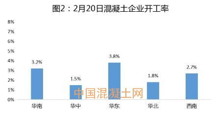 截至2月20日下午14時,國內混凝土企業開工率為13%左右,各區域混凝土企業開工率均保持低位,其中分區域來看(見圖2),華中區域及北方區域混凝土企業開工率較低,開工率僅占樣本的1.5%及1.8%,而更多的企業反饋開工將在3月初以后。華東、華南兩區域開工率相比之下稍微高出1-2個百分點。西南區域混凝土企業開工占比為2.7%。華北、華中兩大區域開工率較低的主要原因在于華中地區湖北地區的疫情嚴重,部分企業供給重點民生、醫院項目,但是絕大多數企業仍處于停產狀態。華北區域由于道路封航,且施工企業開工率較低,重點工程需審批后才可開工,且審批流程相對繁瑣復雜,因此混凝土在疫情嚴重與需求不濟的情況下,開工率相對偏低。