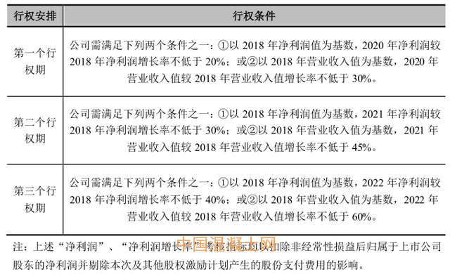 公司需滿足下列兩個(gè)條件之一:①以 2018 年凈利潤值為基數(shù),2020 年凈利潤較2018 年凈利潤增長(zhǎng)率不低于 20%;或②以 2018 年?duì)I業(yè)收入值為基數(shù),2020 年?duì)I業(yè)收入值較 2018 年?duì)I業(yè)收入值增長(zhǎng)率不低于 30%。值得注意的是,這里所說的“凈利潤”、“凈利潤增長(zhǎng)率”考核指標(biāo)均以扣除非經(jīng)常性損益后歸屬于上市公司股東的凈利潤并剔除本次及其他股權(quán)激勵(lì)計(jì)劃產(chǎn)生的股份支付費(fèi)用的影響。