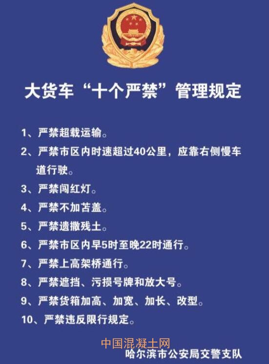 近期,哈爾濱市交警部門針對建筑運輸材料、殘土、爐渣等大型貨運車輛持續開展整治行動,針對大型貨車容易出現的交通違法行為制定了大貨車“十個嚴禁”管理規定。