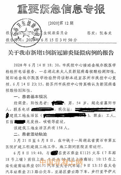 有江蘇群網友爆料,太倉市一建筑工地發現一例新冠病毒核酸檢測陽性患者, 該患者系湖北籍途徑上海返蘇人員,目前為無感染癥狀,正在進行醫學觀察。