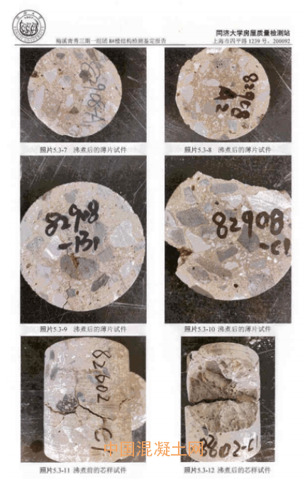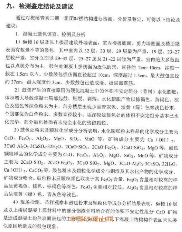 上圖分別為兩份檢測報告中截取,一份是來自國家建筑工程質量監督檢驗中心,一份是來自同濟大學質量檢測站。每份報告上百頁,都表明梅溪青秀三期7#、8#棟質量問題很嚴重。國家建筑工程質量監督檢驗中心鑒定結論確認:“引起混凝土鼓包的骨料為作坊加工破碎的鋼渣廢棄顆粒。”同濟大學質量檢測站檢測鑒定結論確認:“鼓包產生的直接原因為硬化混凝土中的體積不安定組分(骨料)水化膨脹,體積增大導致混凝土局部起鼓、脹裂、剝落。”