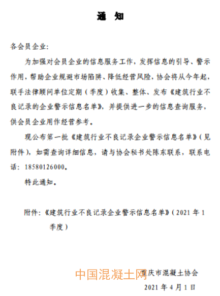 近日,重慶市混凝土協(xié)會(huì)發(fā)布通知稱(chēng),為幫助企業(yè)規(guī)避市場(chǎng)陷阱、降低經(jīng)營(yíng)風(fēng)險(xiǎn),協(xié)會(huì)將從今年起,聯(lián)手法律顧問(wèn)單位定期(季度)收集、整理、發(fā)布《建筑行業(yè)部分擁有不良記錄的企業(yè)警示信息名單》,并提供進(jìn)一步的信息查詢服務(wù)。