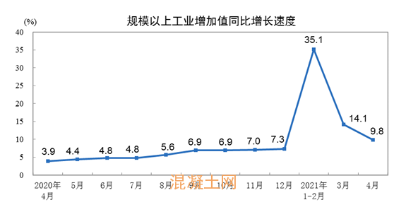 4月份,規模以上工業增加值同比實際增長9.8%(以下增加值增速均為扣除價格因素的實際增長率),比2019年同期增長14.1%,兩年平均增長6.8%。從環比看,4月份,規模以上工業增加值比上月增長0.52%。1—4月份,規模以上工業增加值同比增長20.3%。