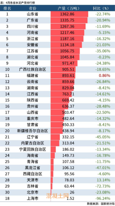 從分省數(shù)據(jù)來看,30省數(shù)市產(chǎn)量均有不同程度的下降,僅有福建省小幅增長0.86%。其中,4月全國14個省市水泥產(chǎn)量同比降幅超20%,上海降96.24%、吉林降72.73%,黑龍江降47.01%、遼寧降45.05%、江蘇降35.06%、貴州降28.48%,云南降26.84%、河北降24.38%、北京降23.08%、內(nèi)蒙古自治區(qū)降21.51、山東降22.74%、安徽降低21.03%和廣東降20.94%。具體情況如下: