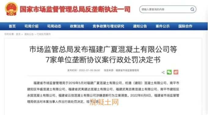 涉案七家公司分別為福建廣夏混凝土有限公司、杭德(建陽)混凝土有限公司、南平市建陽區(qū)華盛混凝土有限公司、福建省武夷建達混凝土有限公司、福建武夷瀝青混凝土有限公司、南平市建陽區(qū)永固混凝土有限公司、福建省云信混凝土有限公司。