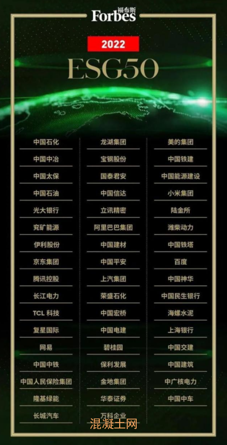 福布斯中國在本月(8月23日)首次發布了中國ESG 50 ,從2022福布斯全球企業2,000強中選取了在Environmental(環境)、Social(社會)和Governance(公司治理)方面處于領先地位的50家代表企業,中國建材,海螺水泥上榜。