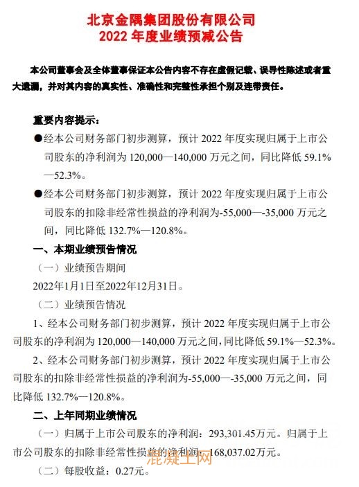 金隅集團1月10日發布公告,預計2022年度實現歸屬于上市公司股東的凈利潤為12—14億元之間,同比降低59.1%—52.3%。