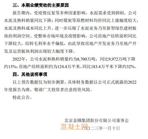公告稱此次業績變動的主要原因為:報告期內,受疫情反復等多種因素影響,水泥需求受到抑制,公司水泥及熟料銷量同比下降;同時煤炭等原燃材料均價同比上漲幅度較大,水泥及熟料成本同比上升,進一步壓縮了水泥業務乃至新型綠色建材板塊的利潤空間。受整體市場環境及疫情影響,公司房地產結轉面積同比下降較大,結轉毛利率水平偏低,由此導致房地產開發業務乃至地產開發及運營板塊利潤出現較大幅度下降。
