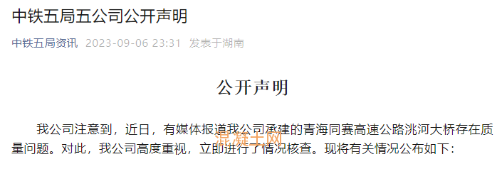 《中鐵五局五公司公開聲明》