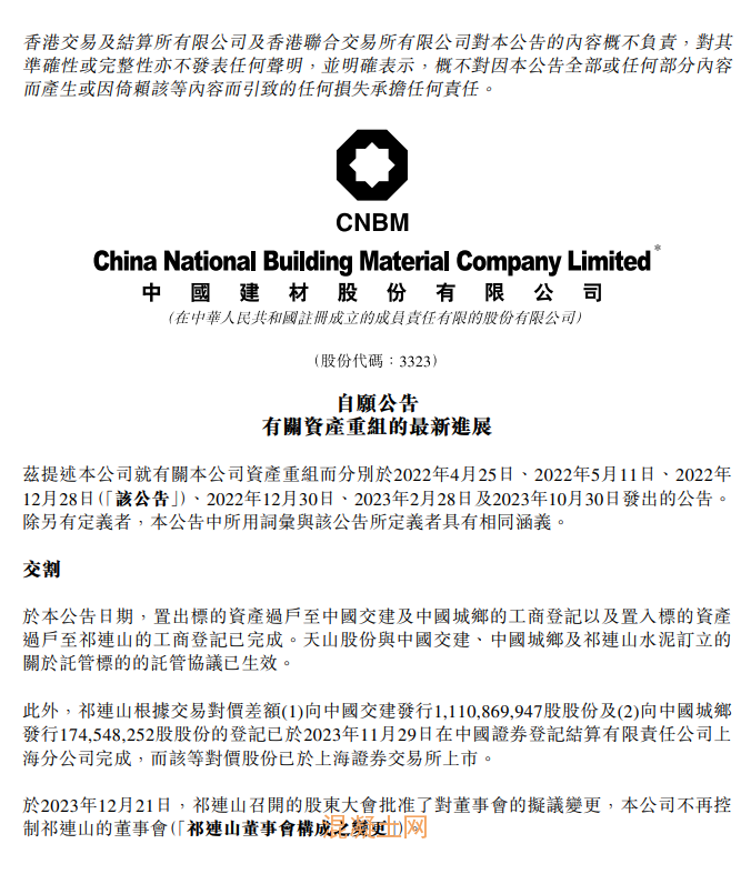 中國(guó)建材12月21日在港交所公告,于公告日期,置出標(biāo)的資產(chǎn)過(guò)戶至中國(guó)交建及中國(guó)城鄉(xiāng)的工商登記以及置入標(biāo)的資產(chǎn)過(guò)戶至祁連山的工商登記已完成。