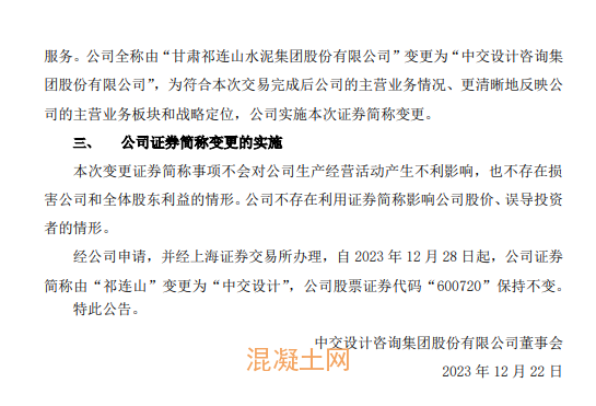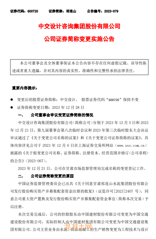 同日 ,上市公司祁連山發(fā)布題為《中交設(shè)計(jì)咨詢集團(tuán)股份有限公司公司證券簡(jiǎn)稱變更實(shí)施公告》文件提到中交設(shè)計(jì)咨詢集團(tuán)股份有限公司已于2023年12月21日,在甘肅市場(chǎng)監(jiān)督管理局完成名稱的變更登記工作。