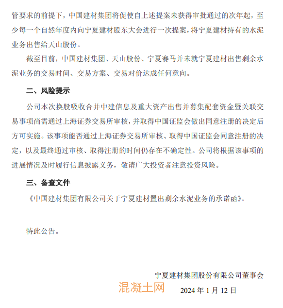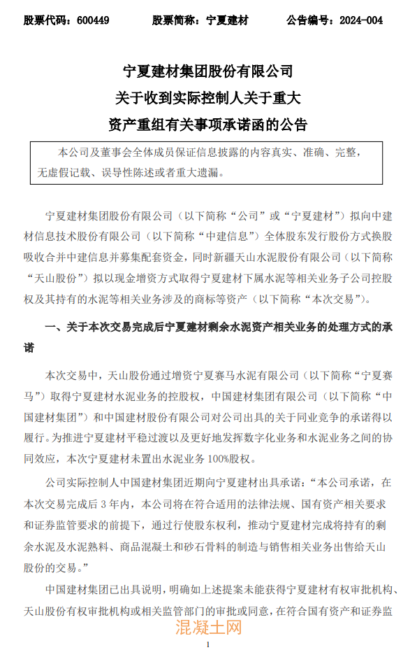 2024年1月13日,寧夏建材集團股份有限公司發布《關于收到實際控制人關于重大資產重組有關事項承諾函》的公告。