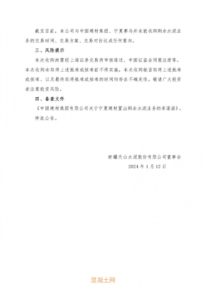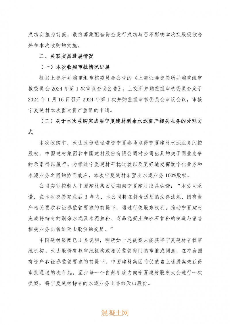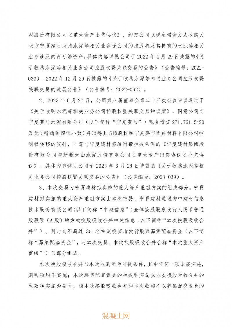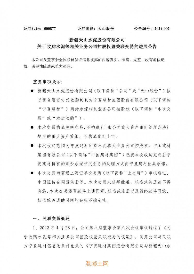 同期,天山股份發布《關于收購水泥等相關業務公司控股權暨關聯交易的進展公告》稱,天山股份擬以現金增資方式收購關聯方寧夏建材所持水泥相關業務公司控股權。