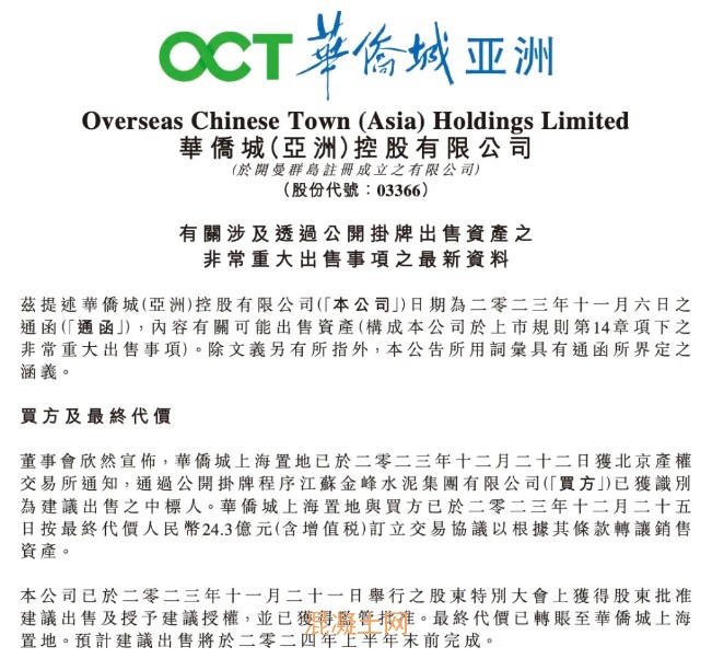2023年底,華僑城發(fā)布公告:旗下華僑城上海置地與金峰水泥就其日前掛牌的上海市靜安區(qū)物業(yè)訂立交易協(xié)議,交易價格24.3億。至此,號稱最貴的酒店上海寶格麗易主江蘇一家民營企業(yè)。