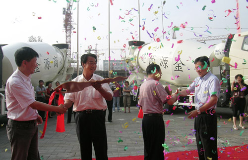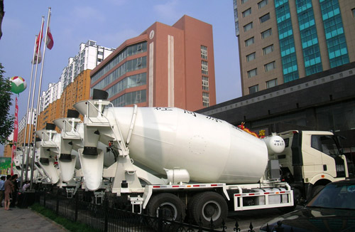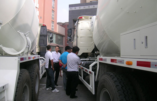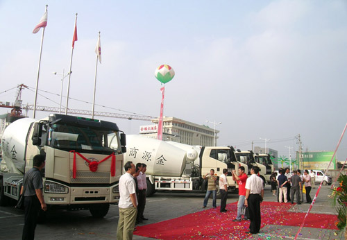 會議結束后,與會代表參觀了樣車,大家對解放J6底盤和中集凌宇的攪拌車上裝表示認可,許多客戶詢問車輛的配置及價格。在參觀樣車的同時,還舉行了解放J6混凝土攪拌車批量交車儀式,在音樂和禮炮聲中,中集領導吳三強和一汽領導荊青春把象征該批10臺車的金鑰匙交到了呼和浩特金源建材有限公司代表的手中。